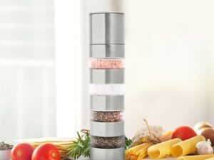 Rozsdamentes acélból készült fűszermalom, amely 4 tárolórésszel rendelkezik, mely egységek sorrendje szabadon változtatható, Ãgy mindig kéznek van az a fűszer, amire szüksége van.